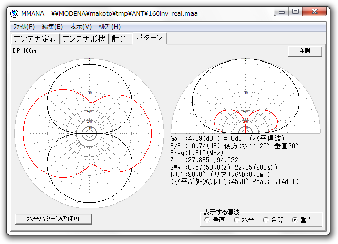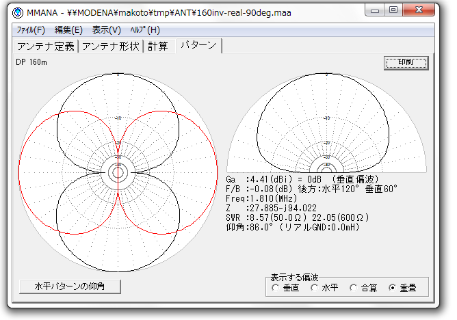 垂直偏波成分。北を上(0 度)とした時。赤は水平偏波部分。 上の図との一貫性が取れない(上下が同じになっている) ので、何か間違えているかも知れない。