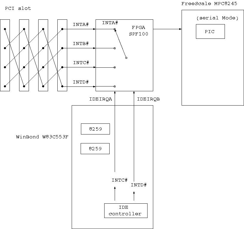 四つの PCI slot , 二つの IDE、Keyboard, Mouse, Floppy, Parallel, Communication Serial Line が接続可能です。また図で SPF100 と書いてあるのは FPGA で IRQ や BUS の接続を制御します。