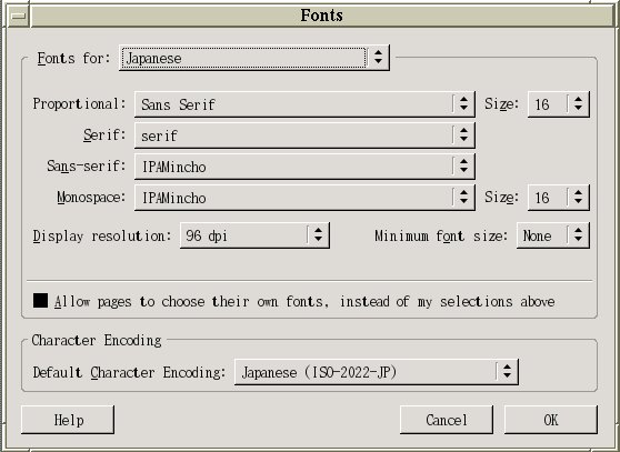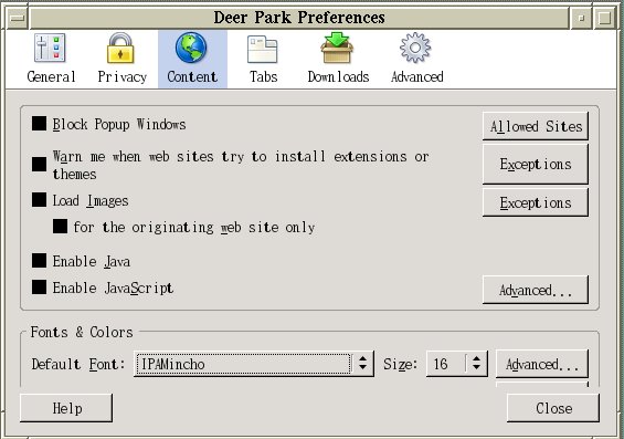 FireFox の Font の設定は、 Edit -> Preference -> Contents の画面で行ないます。