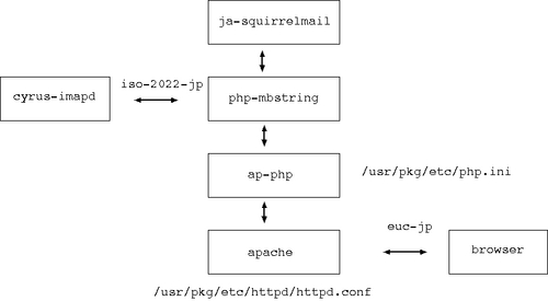 日本語化以前の mail/squirrelmail を使うと、文字が化けてしまいます。